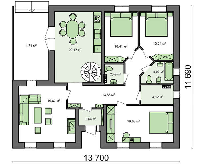 Проект содержит три раздела – Архитектурный, Конструктивный и Инженерный (Водоснабжение, Отопление, Вентиляция, Канализация, Электроснабжение) + Пояснительная записка